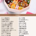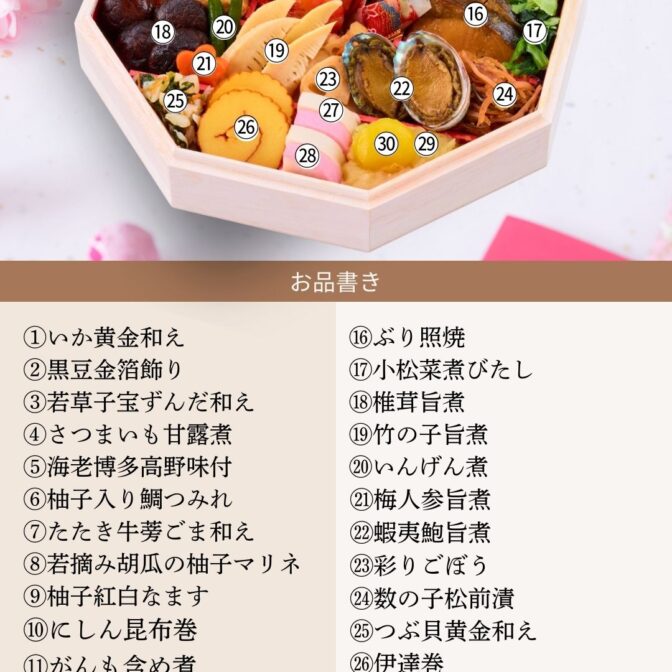 重箱の仕切りが”幸”の文字になっており、縁起の良い八角の重箱で全部食べると「八方に幸せが届きますように。」という願いを込めたおせちです。